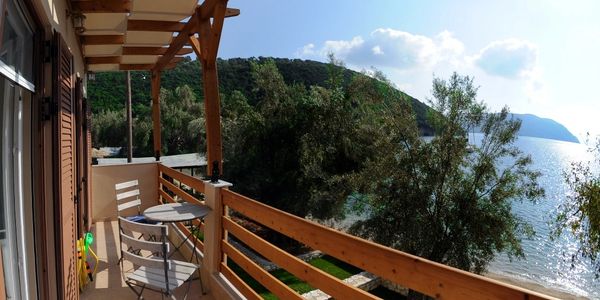 The main bedroom with a Queen size bed has an ensuite bathroom. The view from the bedroom is stunning as directly in front, large double doors open onto a balcony with the sea and mountains ahead.